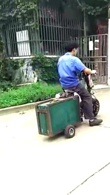 電動車電池載運(yùn)裝置 是由起吊裝置,電動滑板車,電池拖車組成。其目的是為了解決電動車沒有充電樁時(shí)將電池用電動滑板車拖到家里或充電樁處充電。有效解決電動車充電的后顧之憂。工作過程:平時(shí)將電動滑板車、電池小車放在后備箱里,后備箱里有一個起吊裝置。充電時(shí),先將滑板車吊出,然后將電池吊出安裝在滑板車后面,騎行拖走。滑板車還可以單獨(dú)騎行。